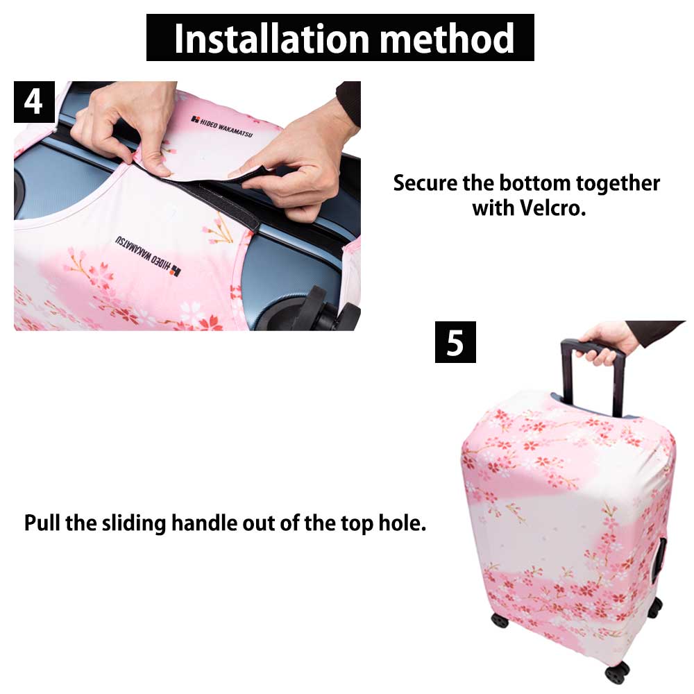 おしゃれな桜柄デザインで、空港での荷物受け取りや大人数での移動時でも、スーツケースが見つけやすくなります。伸縮性のある素材で、スーツケースへの取り付けも簡単です。